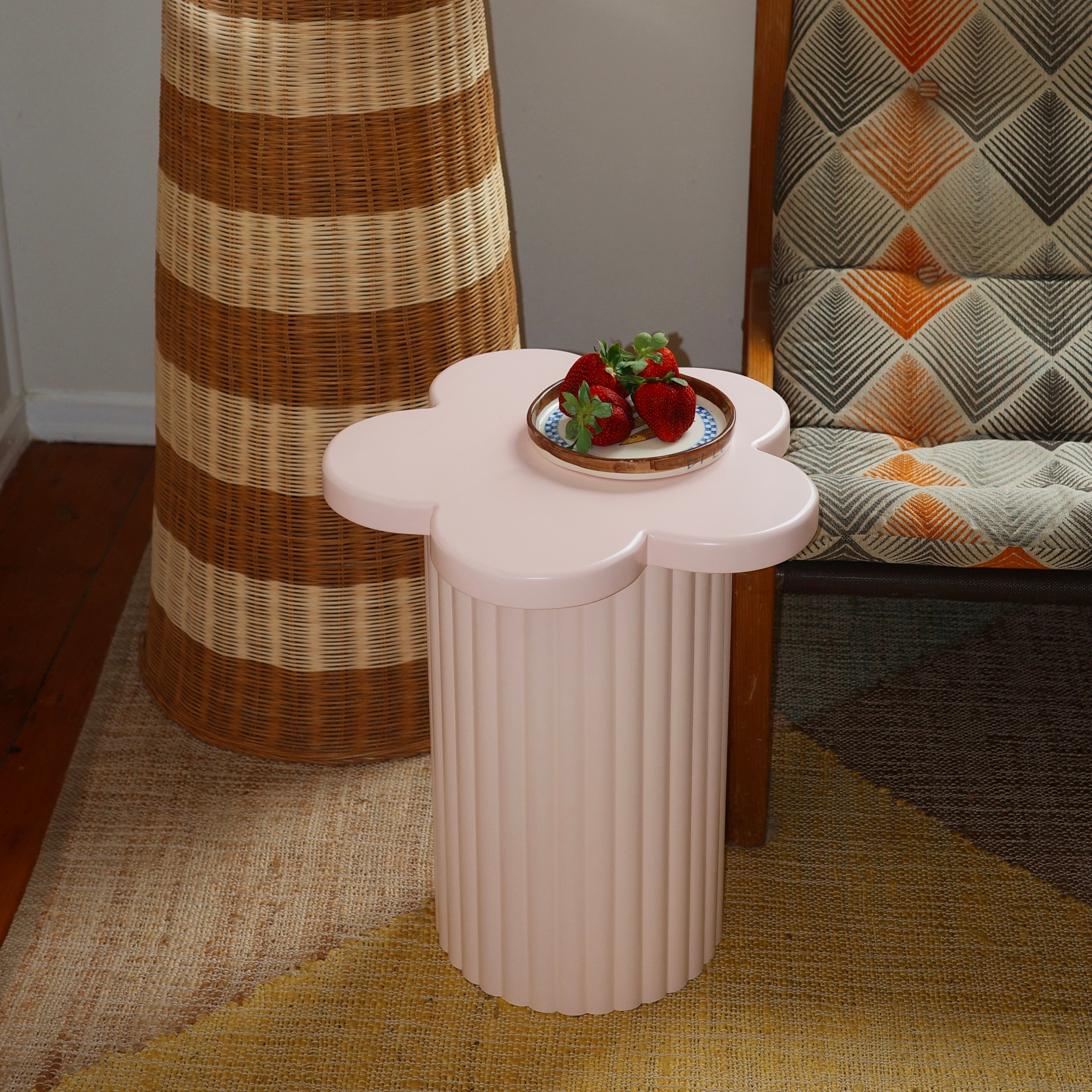 The Flower Side Table is a handcrafted wooden piece featuring our original flower-shaped top and signature grooved base. Finished in a buttery soft 2-pack satin polyurethane, it brings a smooth, sculptural charm to any space.
